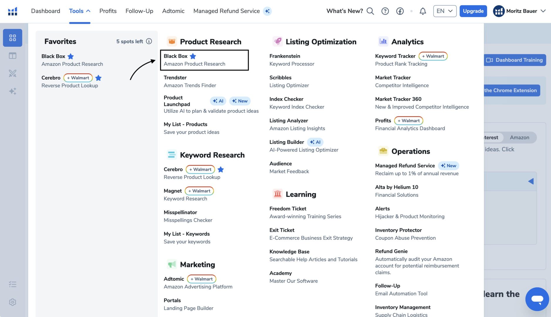 Once you’re on the Helium 10 Dashboard, you will see all 21 tools. You can also see that there’s Black Box: