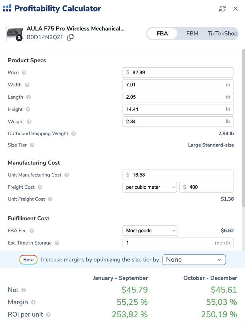 Vous pouvez lancer le Profitability Calculator et calculer directement les coûts, la marge et les frais pour un produit. Grâce à cet outil, vous pouvez voir comment les coûts sont liés à la marge et vous faire une première idée de l’intérêt ou non de vendre le produit.